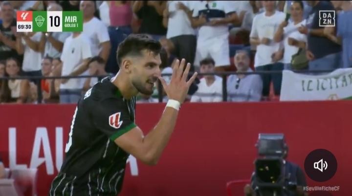 今年夏窗,拉法-米尔从塞维利亚租借加盟埃尔切。在本场比赛中,他攻入一记精彩的任意球,随后做出了一个颇具争议的庆祝动作。
