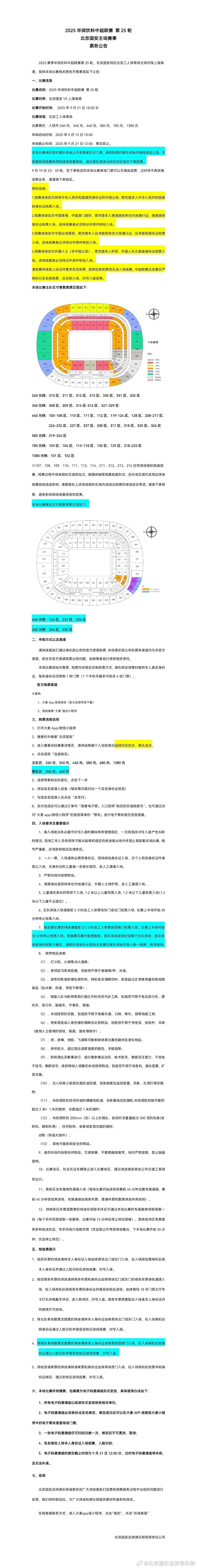 国安官方写道:“2025华润饮料中超联赛第25轮,北京国安将在北京工人体育场主场对阵上海海港,现将本场比赛相关票务开票事宜如下公告,请各位球迷详细阅读图中的公告内容。