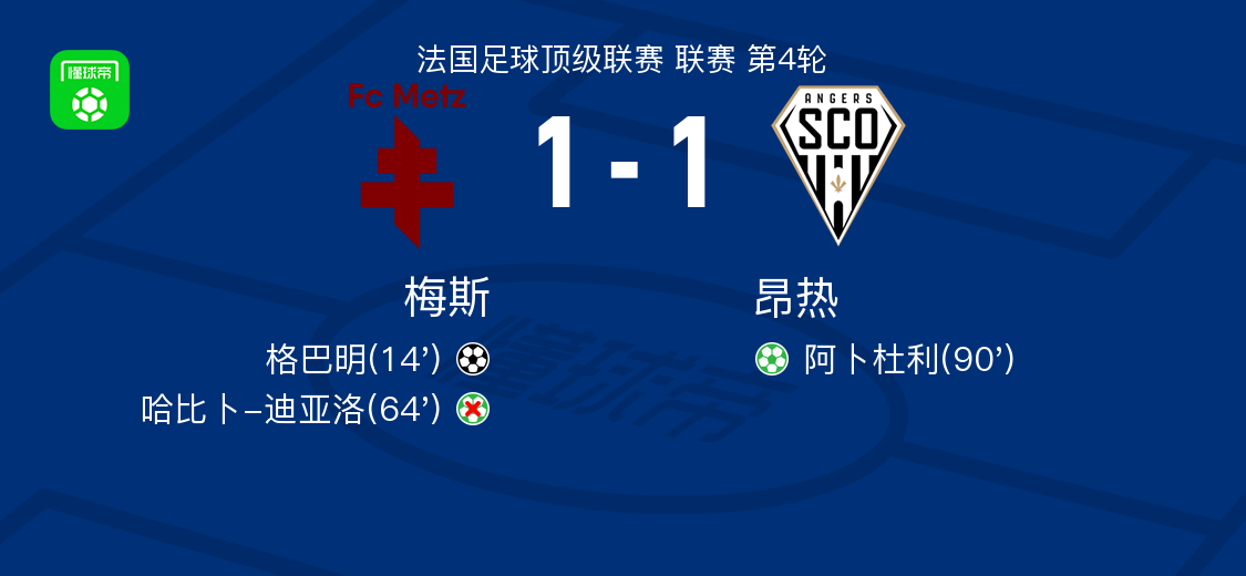 北京时间9月14日,法国足球顶级联赛第4轮,梅斯坐镇主场迎战昂热。比赛进行至早期阶段,梅斯球员艾因送出助攻,格巴明完成破门,为球队首开纪录。随后,梅斯错失一次扩大比分的机会,哈比卜-迪亚洛在点球点上未能把握机会,将球射失。临近比赛结束,昂热球员阿卜杜利冷静主罚点球命中,帮助球队扳平比分。最终,双方以1比1握手言和。