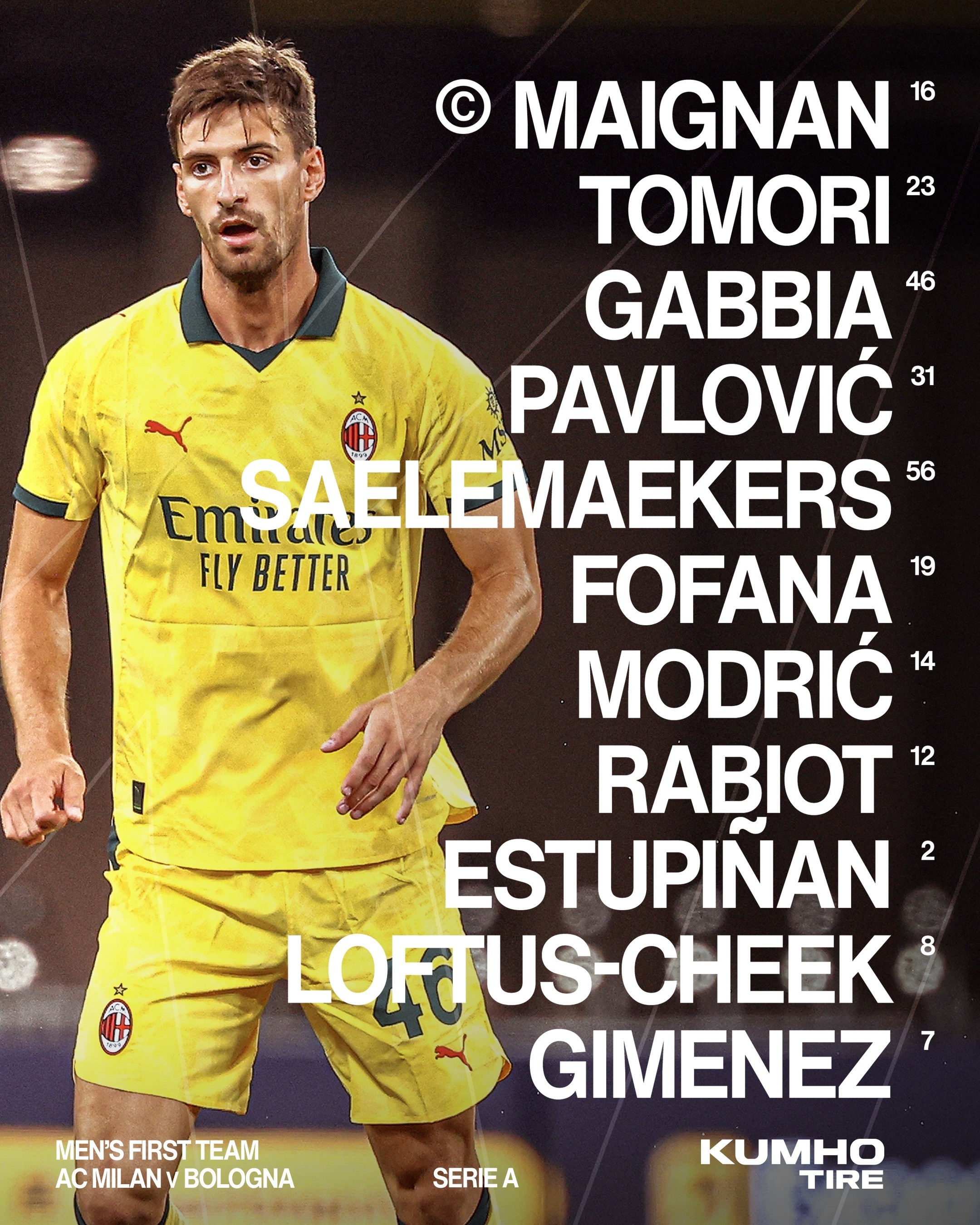 米兰首发:16-迈尼昂、23-托莫里、46-加比亚、31-帕夫洛维奇、56-萨勒马克尔斯、19-优素福-福法纳、14-莫德里奇、12-拉比奥、2-埃斯图皮尼安、8-洛夫图斯-奇克、7-圣地亚哥-希门尼斯
