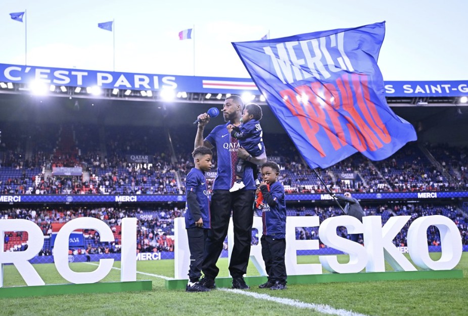 巴黎圣日耳曼全队球员都身穿印有“Merci Presko”(谢谢你,普雷斯科)的白色T恤。马尔基尼奥斯与队友们围在金彭贝身边,拍下一张“全家福”合影,随后把他高高举起致敬。这位后卫脸上带着笑容,眼中满是激动,不停地与队友、恩里克及其教练组、纳赛尔、路易斯-坎波斯以及俱乐部所有高层拥抱、握手。