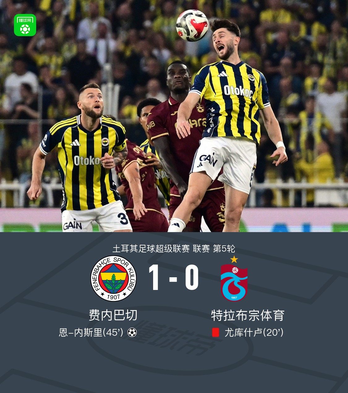 土耳其足球超级联赛第5轮,费内巴切主场迎战特拉布宗体育。比赛第20分钟,特拉布宗体育球员尤库什卢因犯规被裁判直接出示红牌罚下,导致球队少一人作战。上半场临近结束时,费内巴切球员恩-内斯里抓住机会,攻入全场唯一进球。最终,费内巴切以1比0战胜对手,全取三分。
