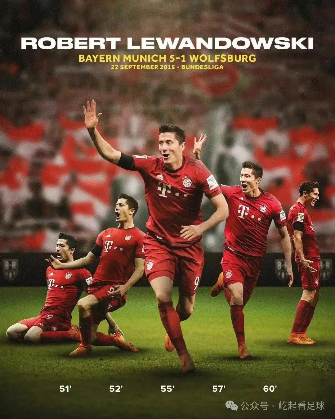 足球世界最神奇的纪录之一,它完美定义了足球世界的不可能的可能。2015年9月22日德甲第6轮,拜仁主场迎战沃尔夫斯堡。这也是前一年德甲冠、亚军之间的直接对话,堪称“天王山之战”。上半场狼堡由卡利朱里首开纪录,拜仁0:1落后。下半场莱万替补出场开启了暴走模式,从第51分钟开始,分别在第51、52、55、57和60分钟疯狂的打入5球,完成最不可思议的逆转,整个足坛都为之疯狂。时任主教练瓜迪奥拉也留下了这个经典镜头。