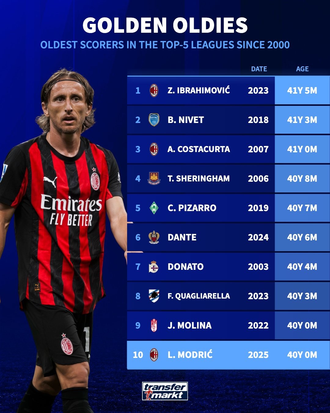 根据统计,莫德里奇也就此以40岁的年纪成为了自2000年以来在欧洲五大联赛中进球最年长的10位球员之一,他在这10名球员中位列第10。值得一提的是,排名前10的球员中有3位都来自于AC米兰。