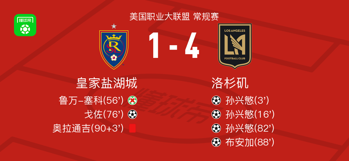 北京时间9月18日美国职业大联盟 常规赛,皇家盐湖城主场对阵洛杉矶。皇家盐湖城戈佐破门。洛杉矶孙兴慜帽子戏法,布安加破门。最终比分皇家盐湖城 1–4 洛杉矶。