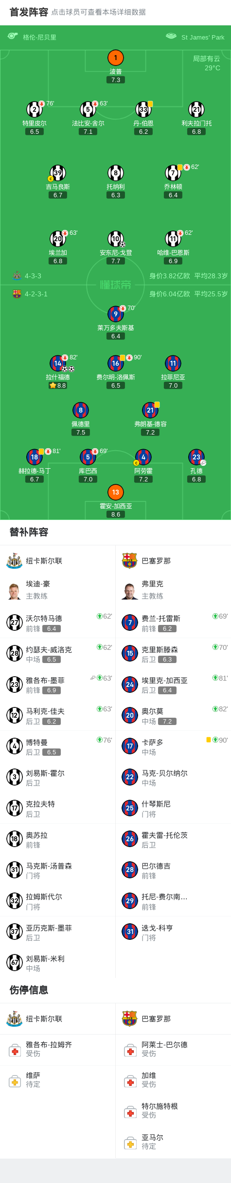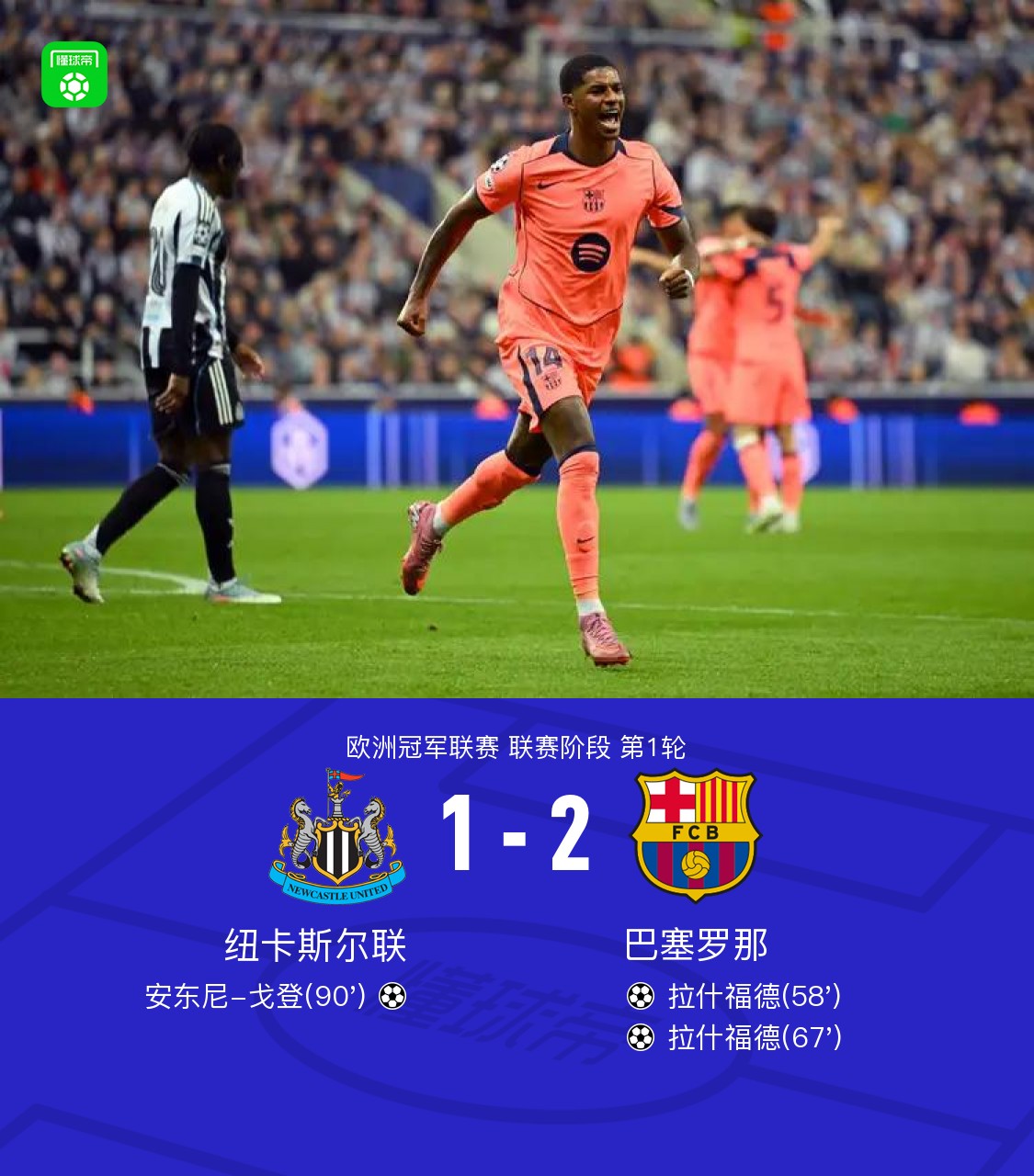 北京时间9月19日欧洲冠军联赛 联赛阶段 第1轮,纽卡斯尔联对阵巴塞罗那。上半场拉什福德左路突破打门踢偏,巴恩斯打门被加西亚神勇扑出,拉菲尼亚任意球造险,下半场拉什福德头球破门,随后拉什福德世界波远射梅开二度,戈登推射破门扳回一球。最终比分纽卡斯尔联 12 巴萨。