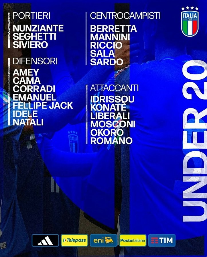 北京时间9月19日,意大利U20国青队公布了他们参加本月U20世界杯的大名单,AC米兰、国际米兰以及罗马各有两名年轻球员入选,皇家马德里和尤文图斯也有一人得到征召。