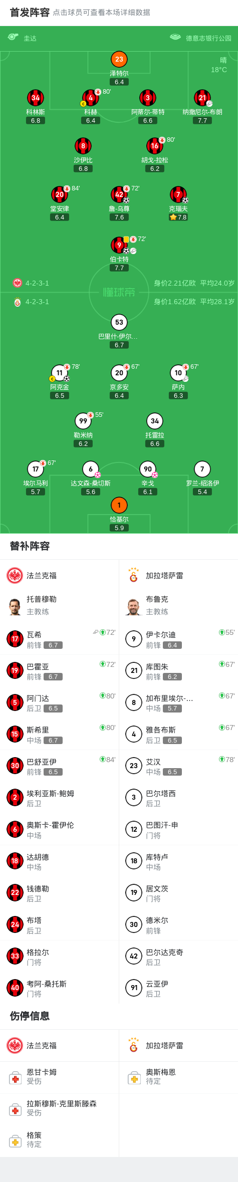 第45+4分钟,主队开出任意球,伯卡特头槌破门,法兰克福3-1