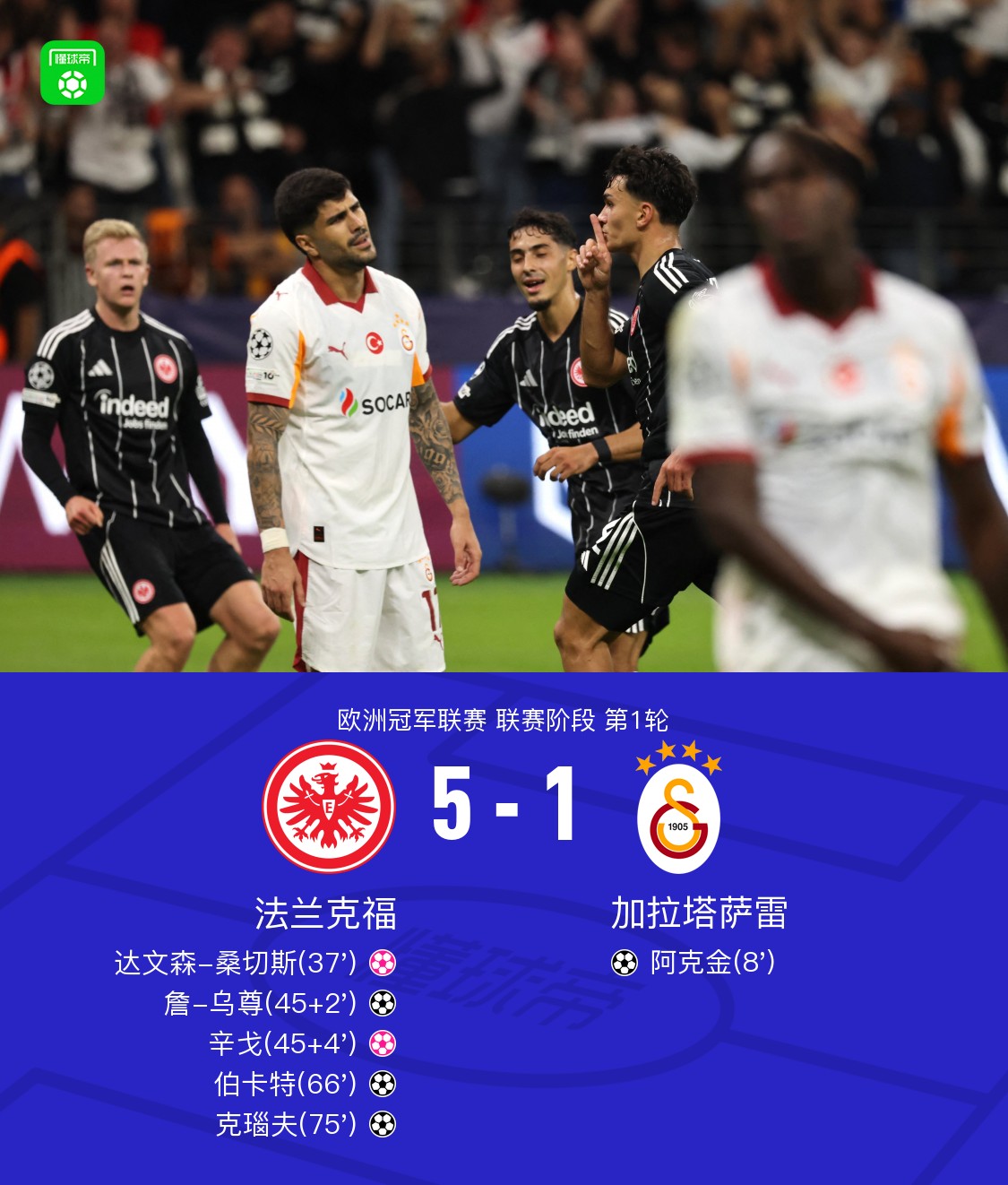 北京时间9月19日,欧洲冠军联赛联赛阶段第1轮,法兰克福迎战加拉塔萨雷。比赛伊始,加拉塔萨雷由萨内送出助攻,阿克金率先破门。随后,达文森-桑切斯不慎自摆乌龙,为法兰克福扳回一城。上半场补时阶段,伯卡特送出助攻,詹-乌尊推射得手,将比分反超。紧接着,辛戈解围失误,皮球入网,再度为对手贡献一粒乌龙球。进入下半场,纳撒尼尔-布朗精准传球,伯卡特冷静施射建功。第75分钟,瓦希突破后助攻克瑙夫破门,进一步扩大领先优势。最终全场结束,法兰克福以5比1战胜加拉塔萨雷。