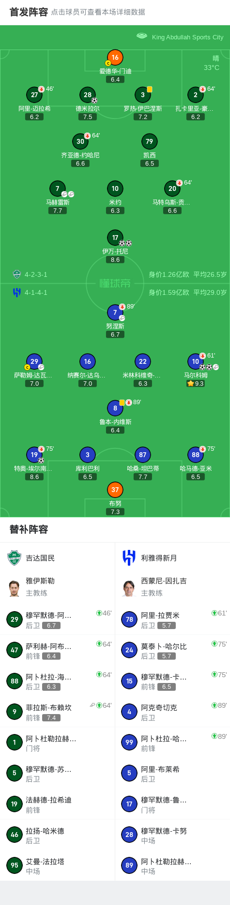 第90+1分钟,让三追三,德米拉尔禁区抢点头球破门扳平比分,吉达国民3-3
