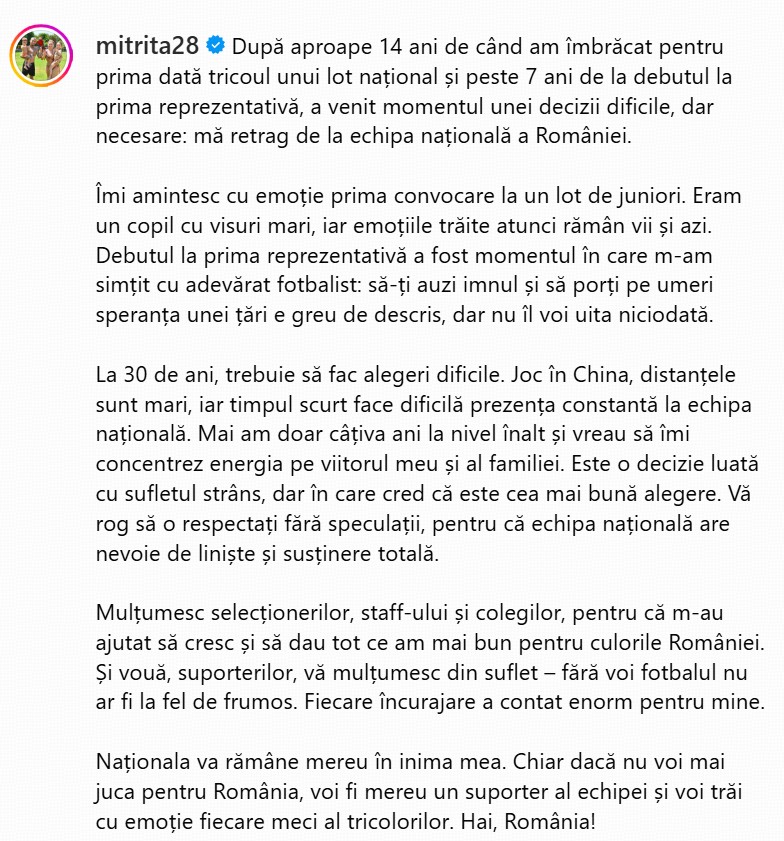 自首次身披国青队战袍至今已近14年,代表成年国家队出战也已逾7载。如今,是时候做出一个艰难却必要的决定:我将从罗马尼亚国家队退役。