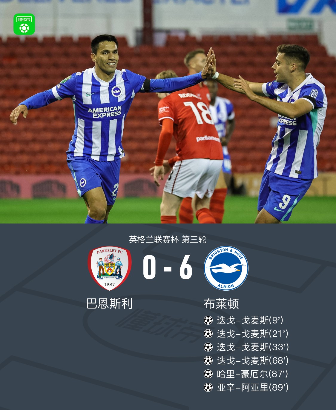 北京时间9月24日英格兰联赛杯 第三轮,巴恩斯利对阵布莱顿。布莱顿迭戈-戈麦斯大四喜,哈里-豪厄尔破门,亚辛-阿亚里破门。最终比分巴恩斯利 06 布莱顿。