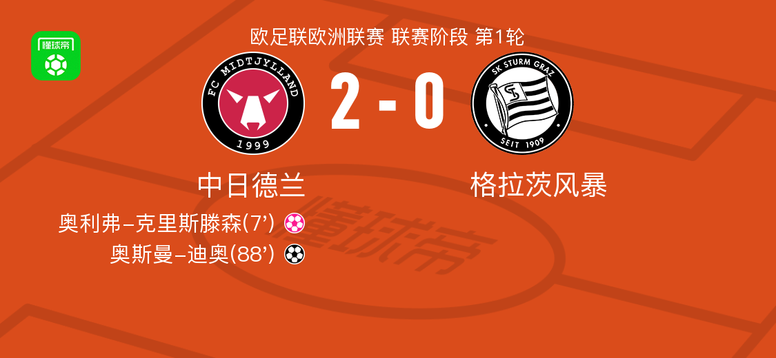 北京时间9月25日,欧足联欧洲联赛联赛阶段第1轮展开较量,中日德兰迎战格拉茨风暴。比赛伊始,格拉茨风暴球员奥利弗-克里斯滕森不慎自摆乌龙,为中日德兰取得领先。随后,西姆西尔送出助攻,奥斯曼-迪奥破门得分,进一步扩大优势。全场比赛结束,中日德兰以2-0战胜格拉茨风暴。