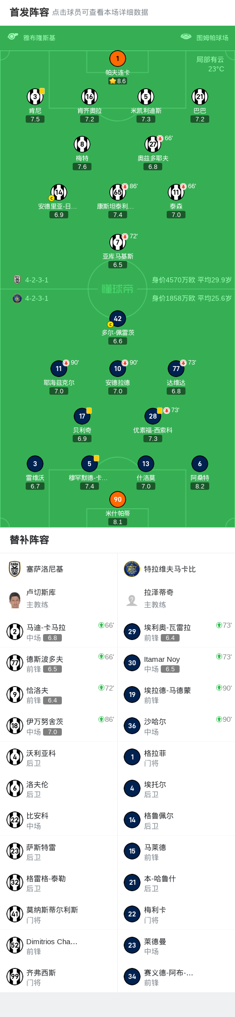 北京时间9月25日欧足联欧洲联赛 联赛阶段 第1轮,塞萨洛尼基对阵特拉维夫马卡比。最终比分塞萨洛尼基 0–0 特拉维夫马卡比。