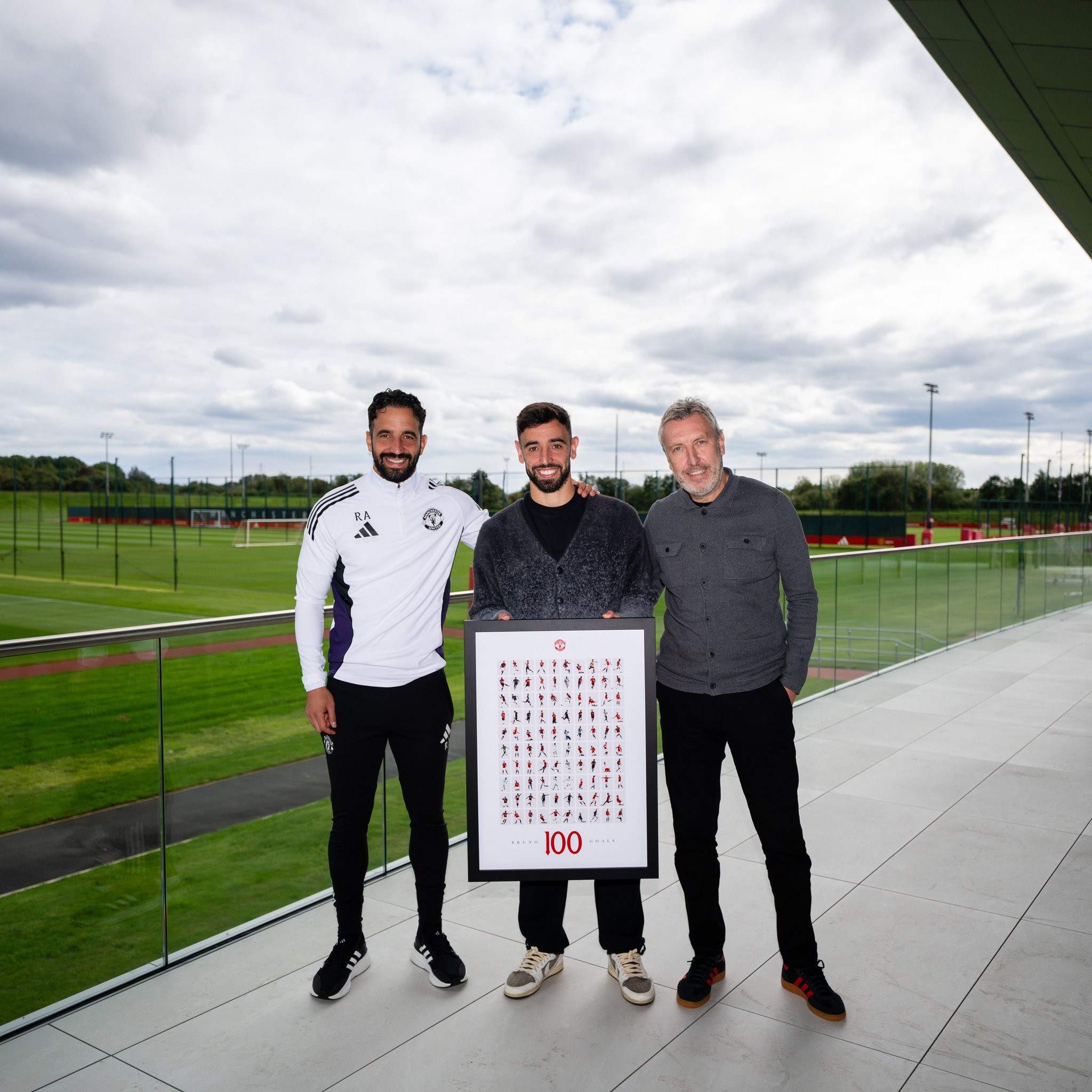 曼联队长布鲁诺-费尔南德斯在英超第5轮主场2-1击败切尔西的比赛当中打进一球,这也是他为俱乐部效力以来所取得的第100个进球,为此曼联特意向他赠送了一份纪念品。