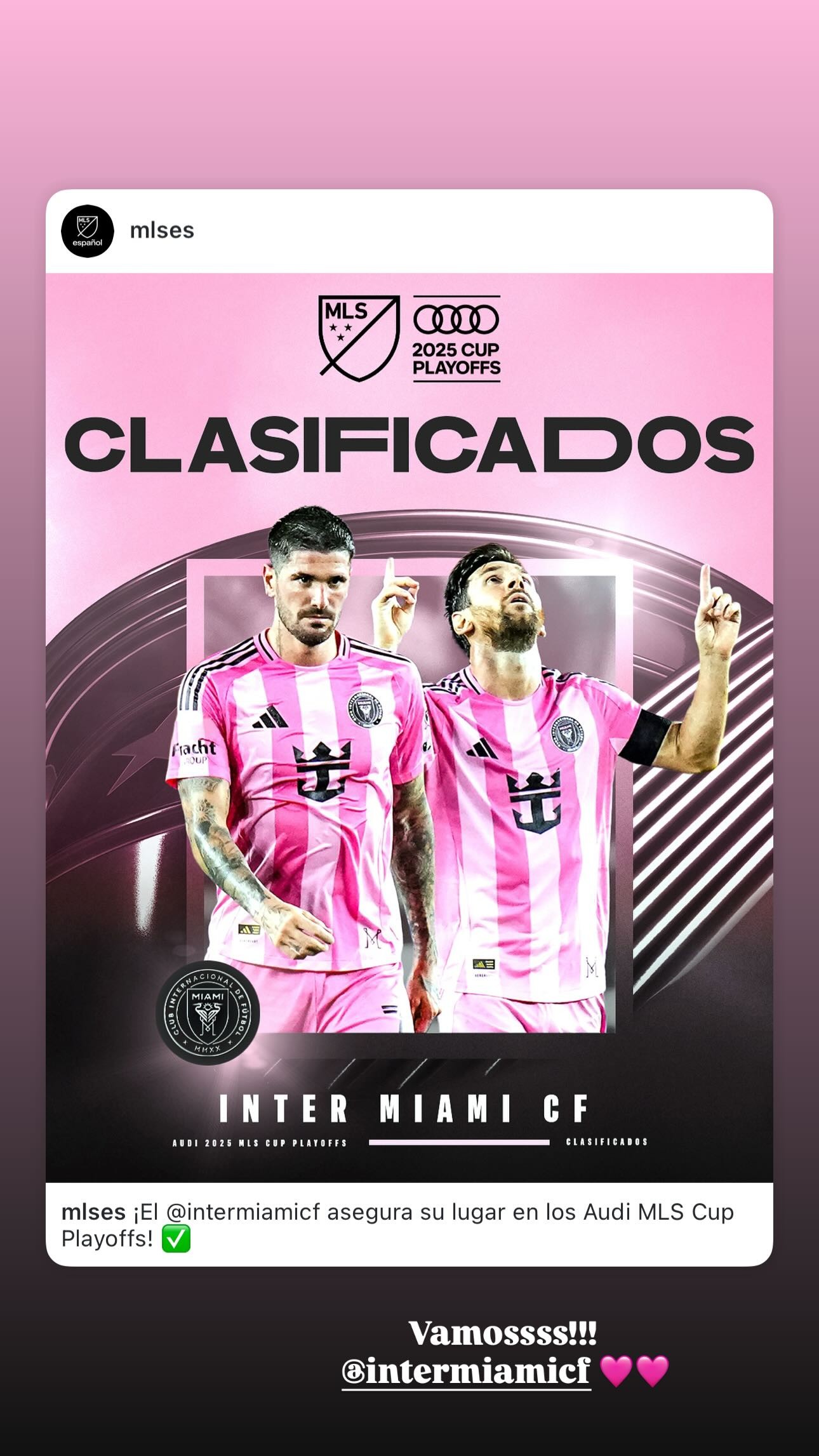 比赛结束后,迈阿密国际中场德保罗分享了迈阿密国际晋级美职联季后赛的海报并写道:“加油!!!迈阿密国际。”同时他还配上了两颗粉色的爱心。
