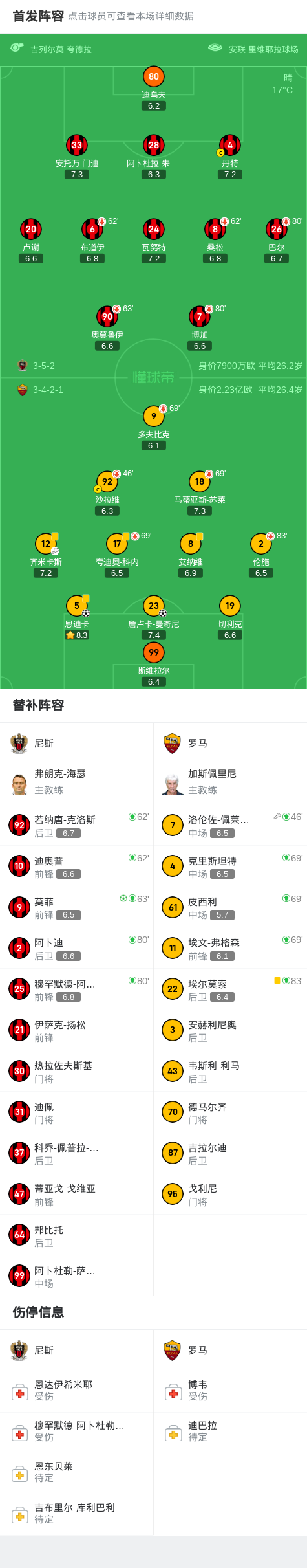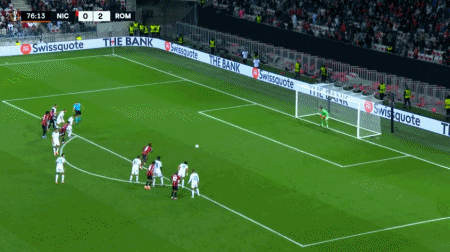 第52分钟,佩莱格里尼角球开出,恩迪卡头球破门打破僵局,罗马1-0尼斯