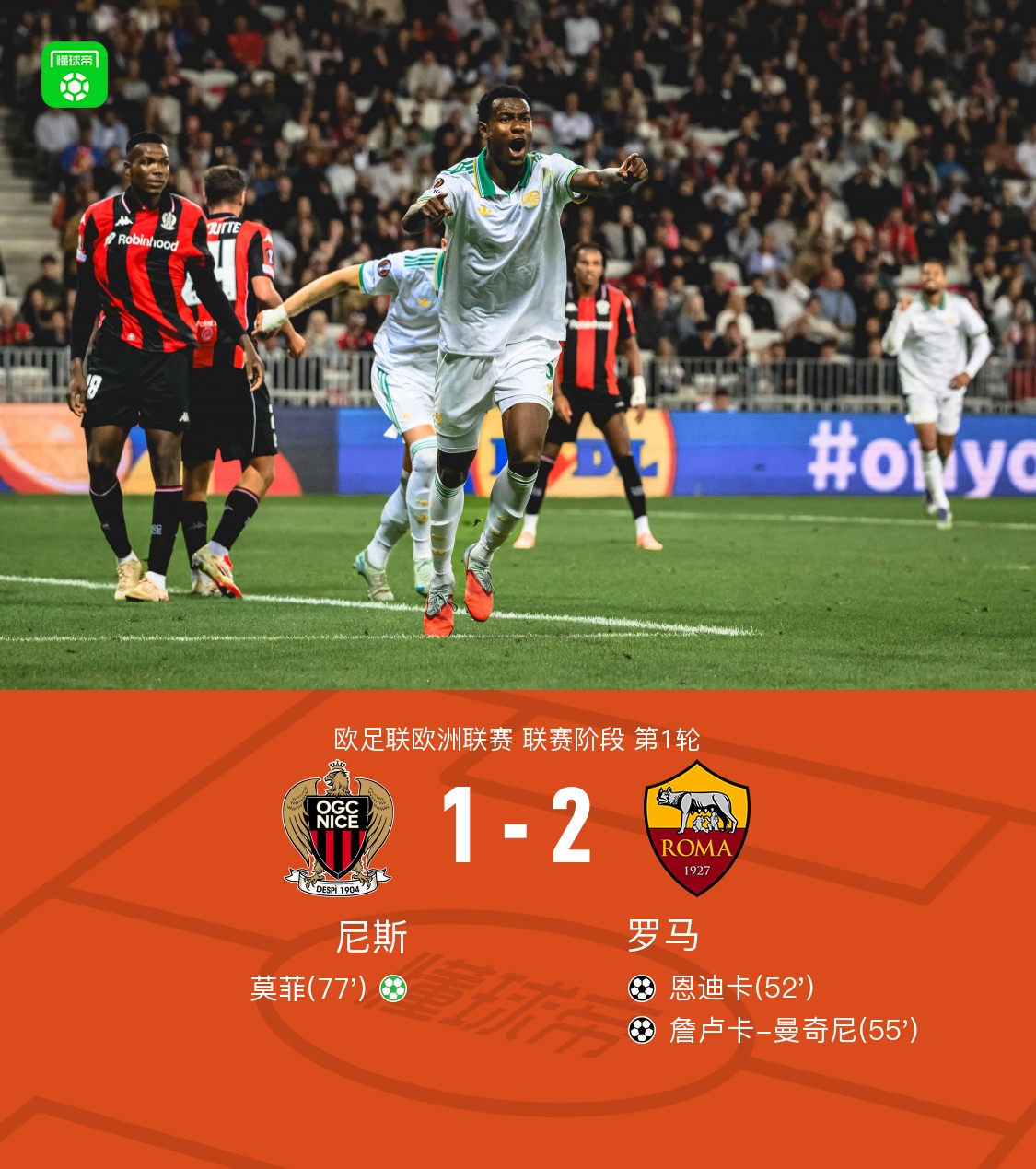 第76分钟,皮西利送点,莫菲主罚点球命中扳回一分,尼斯1-2罗马