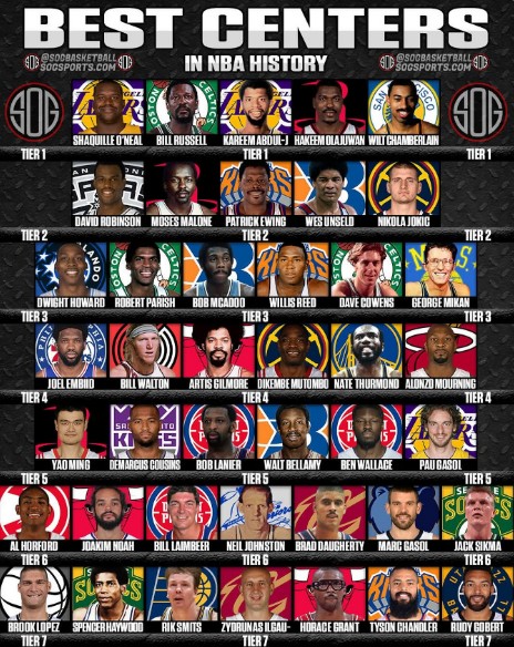 美国媒体sogbasketball对历史中锋进行了分档,其中奥尼尔领衔第一档的五大中锋,约基奇位列第二档,而姚明则排在第五档。