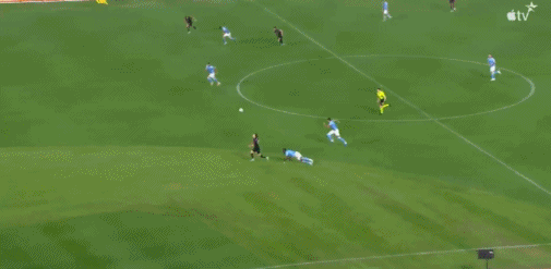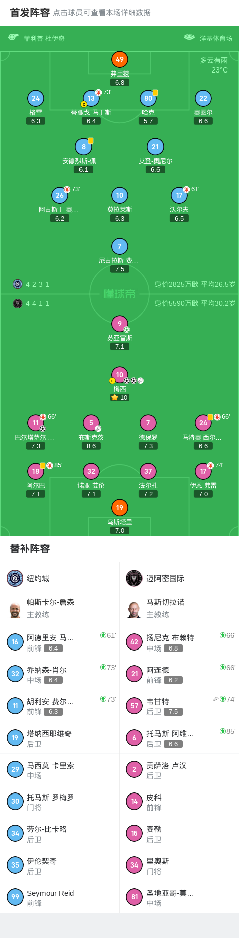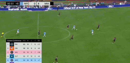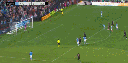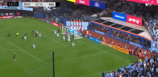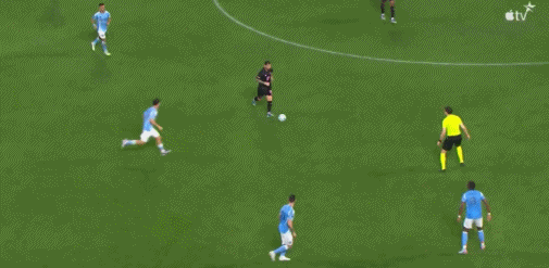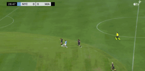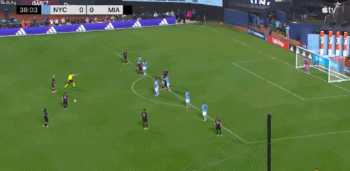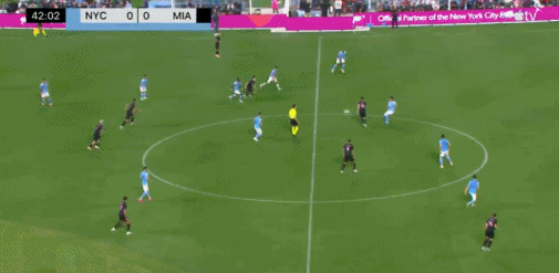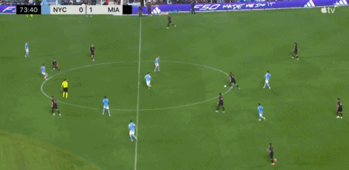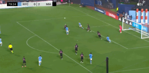 第74分钟,布斯克茨直塞,梅西单刀挑射破门,迈阿密国际2-0纽约城