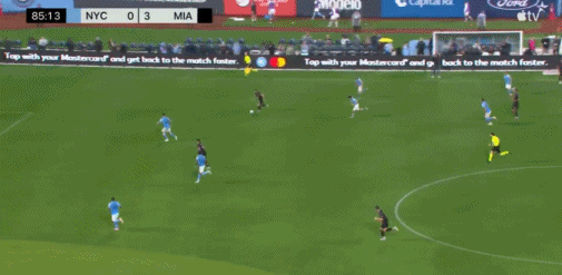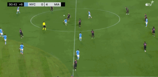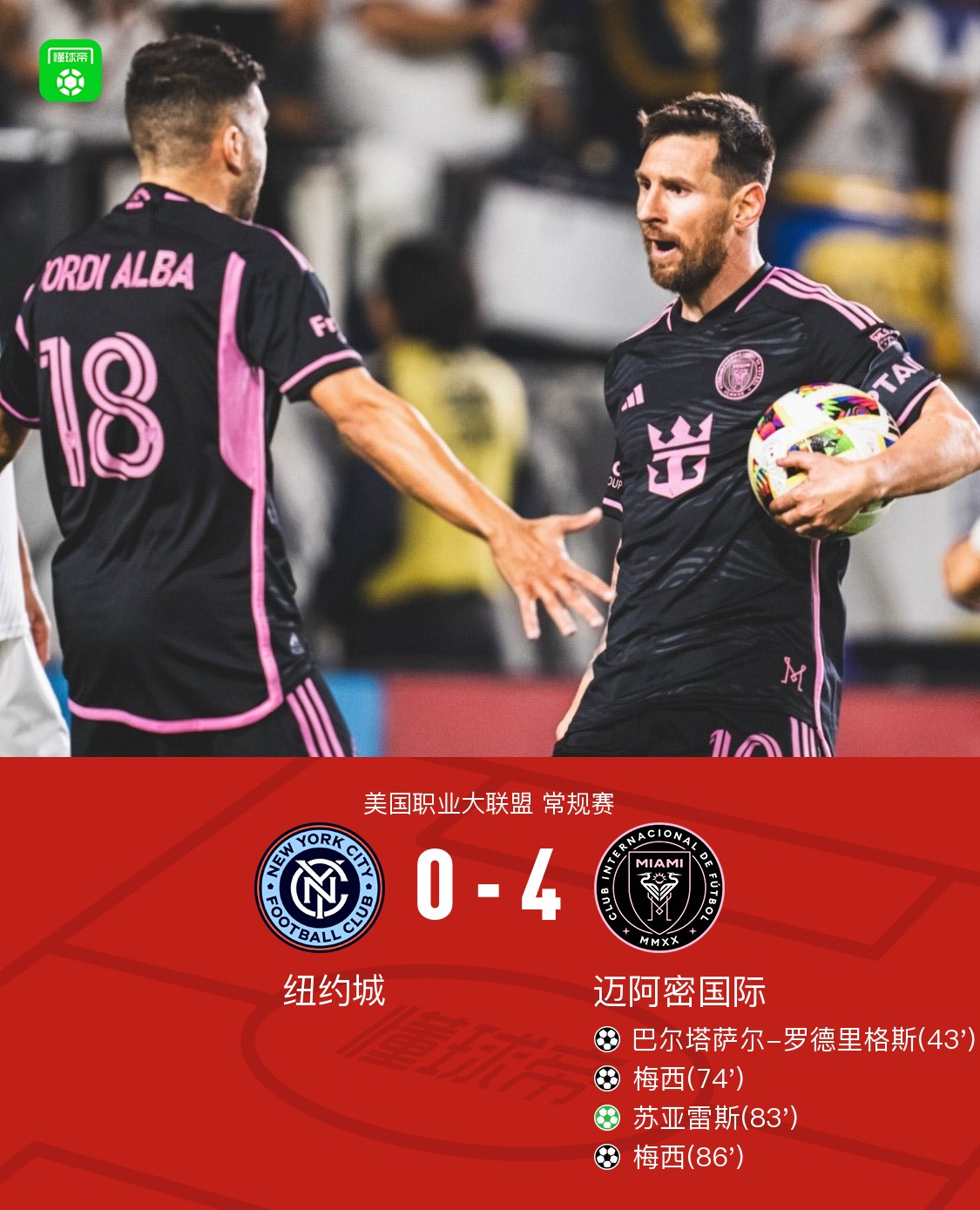 第86分钟,梅西一条龙突入禁区再度破门,迈阿密国际4-0纽约城