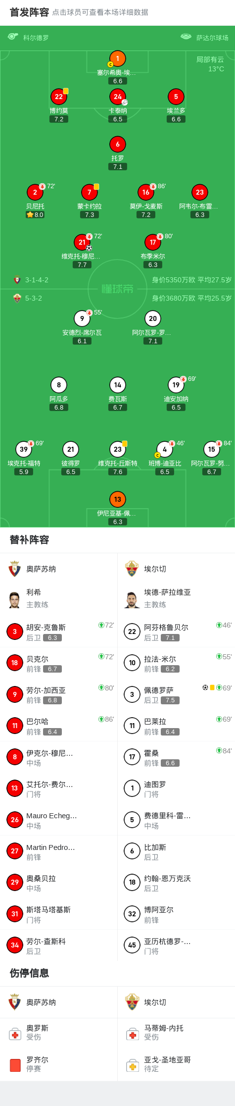 北京时间9月26日西班牙足球甲级联赛 联赛 第6轮,奥萨苏纳主场对阵埃尔切。奥萨苏纳维克托-穆尼奥斯破门。埃尔切佩德罗萨破门。最终比分奥萨苏纳 11 埃尔切。