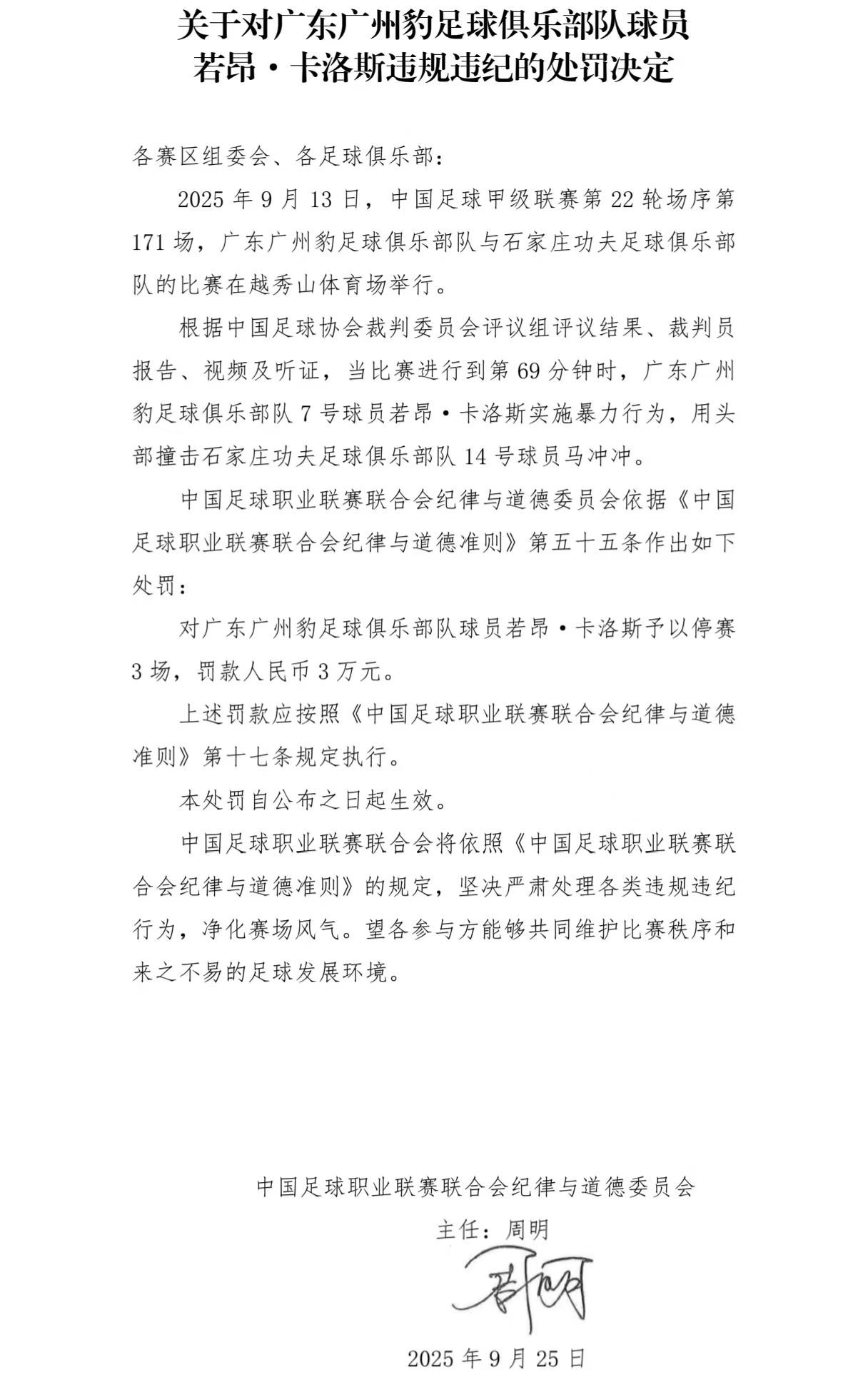 中国足球职业联赛联合会纪律与道德委员会依据《中国足球职业联赛联合会纪律与道德准则》第五十五条作出如下处罚: