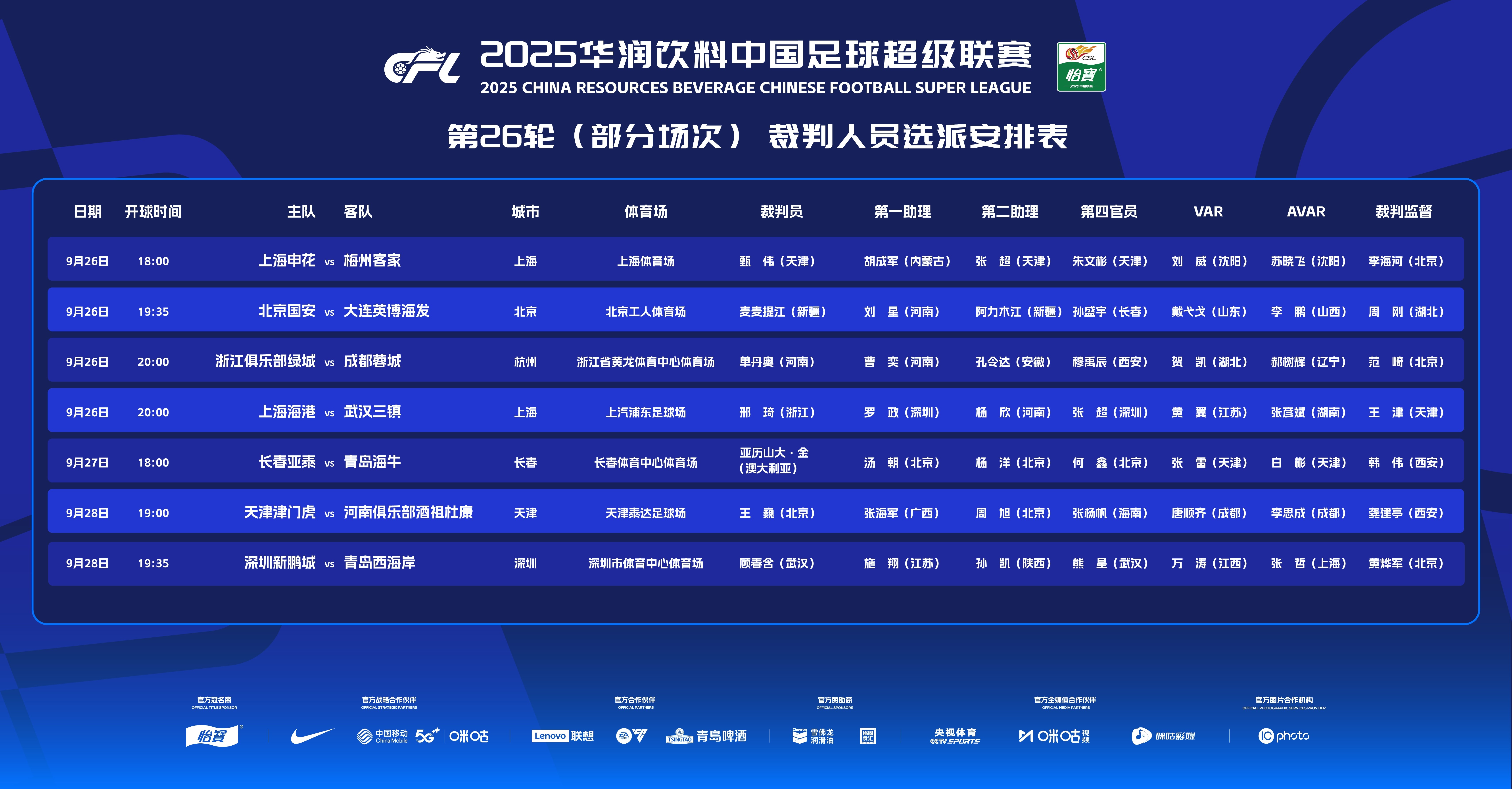 北京时间9月26日,中超第26轮(部分场次)的裁判名单公布,麦麦提江执法国安vs英博,亚历山大-金吹亚泰vs海牛。
