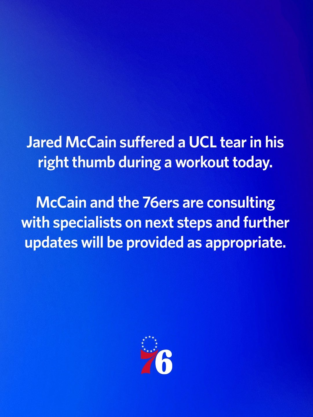 北京时间9月26日,费城76人官方消息,后卫麦凯恩右手拇指前交叉韧带撕裂。