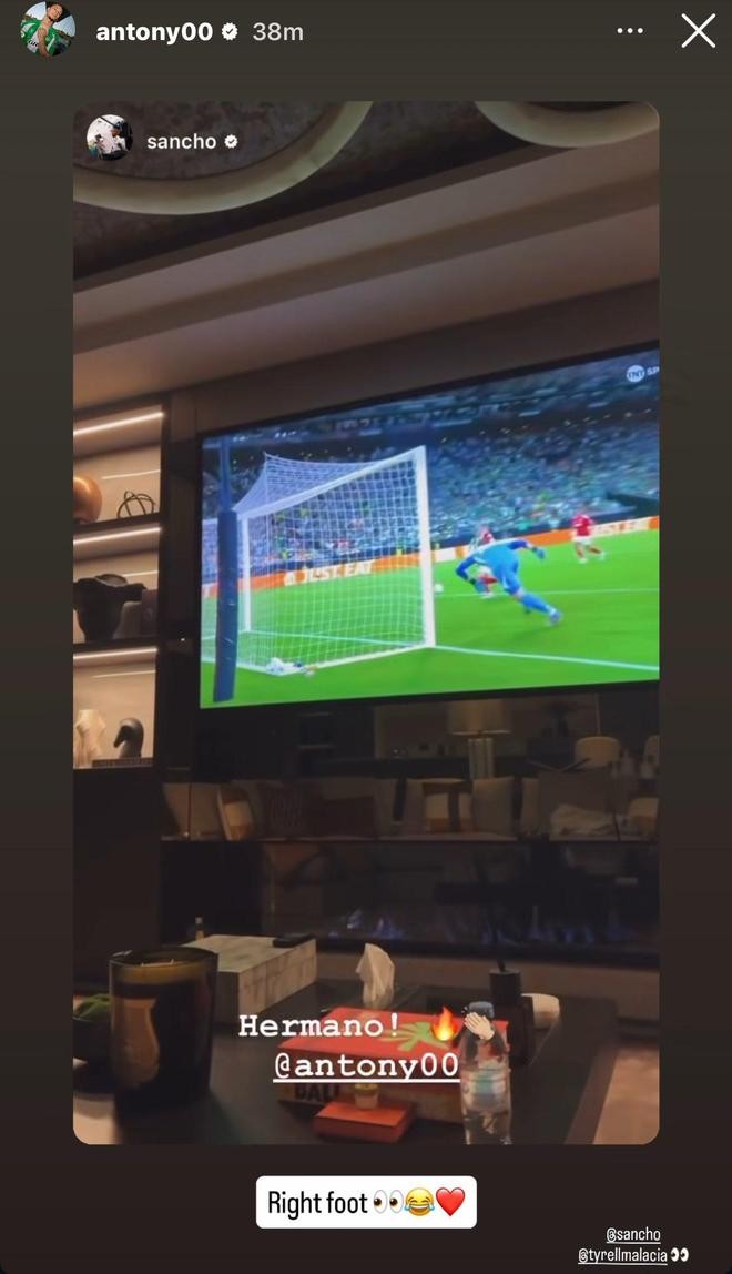 安东尼对桑乔的赞美感到欣喜,并作出了回应,这位巴西球员还开玩笑地提到这是用右脚进的。