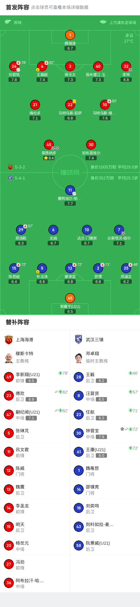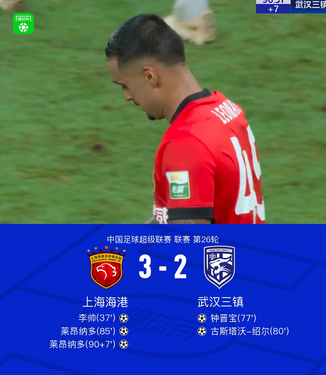 北京时间9月26日中国足球超级联赛 联赛 第26轮,上海海港主场对阵武汉三镇。上海海港李帅破门,莱昂纳多梅开二度。武汉三镇钟晋宝破门,古斯塔沃-绍尔破门。最终比分上海海港 3–2 武汉三镇。