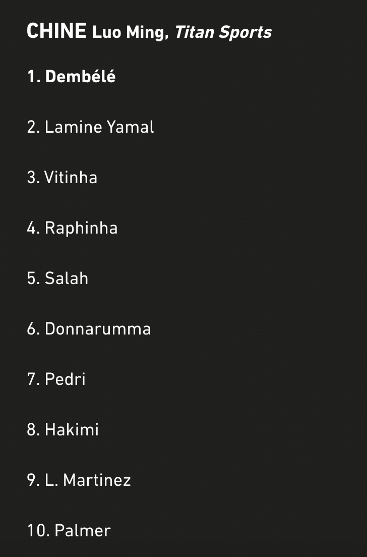 中国记者骆明金球奖投票:登贝莱亚马尔前二,前五人选与结果一致