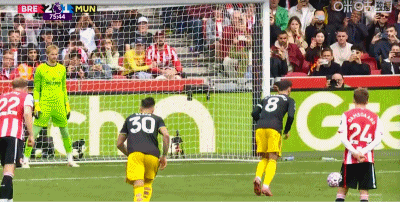 第76分钟,B费主罚点球被凯莱赫扑出,曼联仍1-2布伦特福德