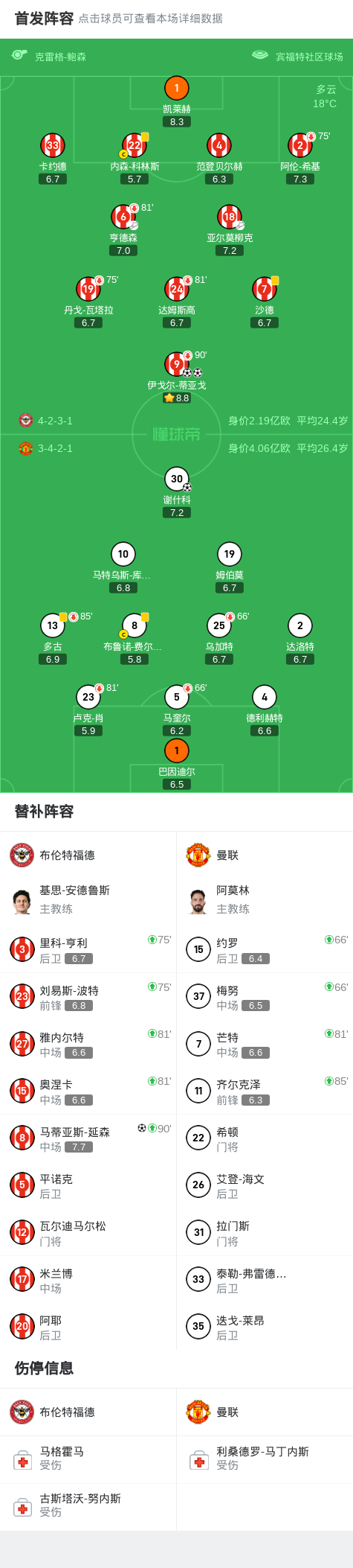 第26分钟,谢什科补射打进曼联生涯首球,曼联1-2布伦特福德!