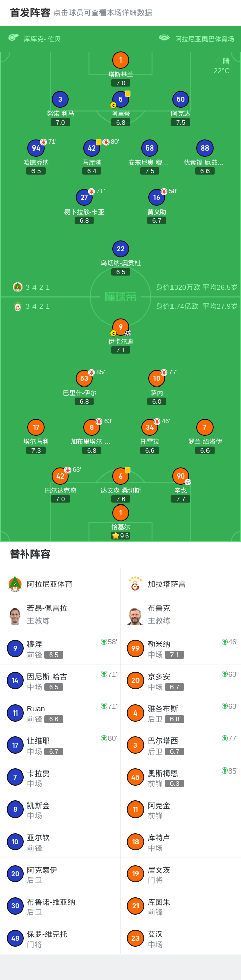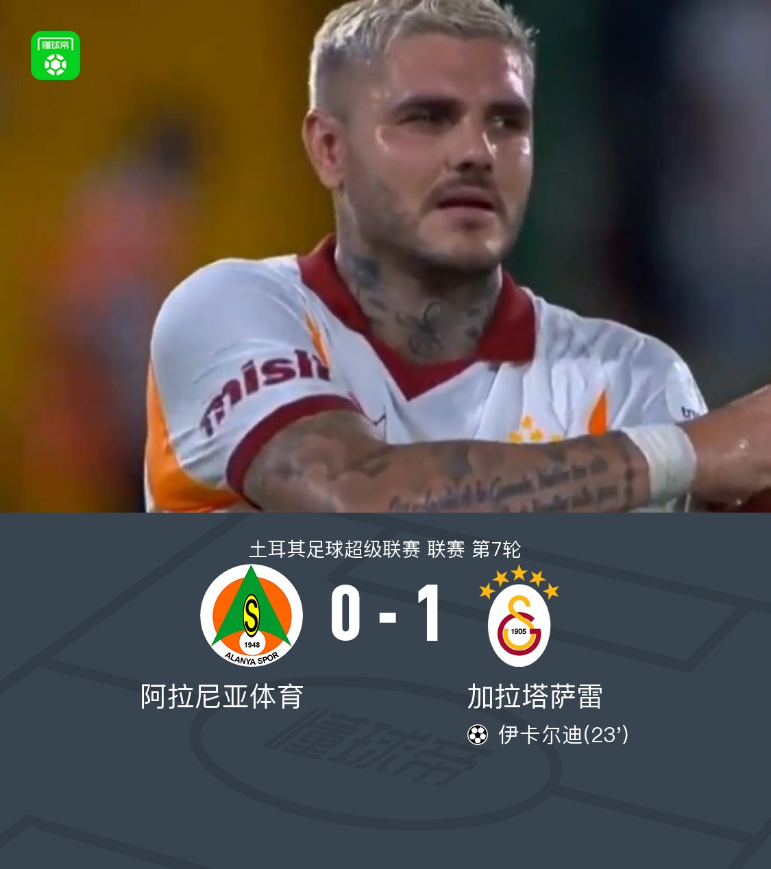 第23分钟,辛戈强突送助攻,伊卡尔迪写意脚后跟破门,加拉塔萨雷1-0!