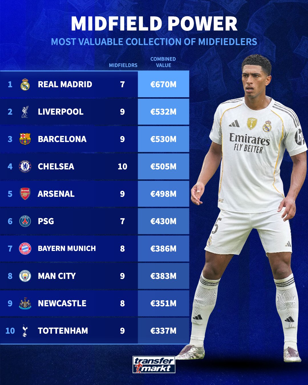 德转列中场身价排行榜:皇马领跑、利物浦次席,纽卡位列第九