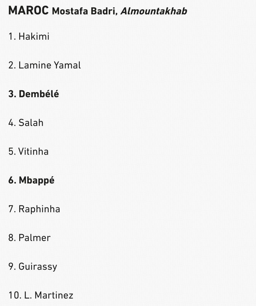 金球奖主办方《法国足球》公布了2025年男足金球奖投票详情,摩洛哥记者Mostafa Badri的投票顺序前五分别是阿什拉夫、亚马儿、登贝莱、萨拉赫和维蒂尼亚。