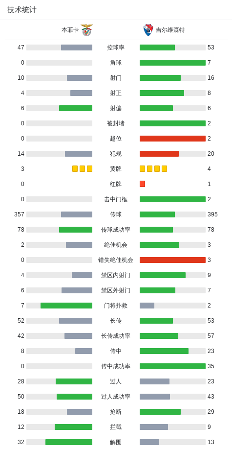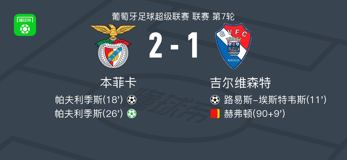 北京时间9月27日,葡萄牙足球超级联赛第7轮展开较量,本菲卡坐镇主场迎战吉尔维森特。比赛中,路易斯-埃斯特韦斯为客队率先破门,取得领先。随后帕夫利季斯为本菲卡扳平比分,并在之后通过点球完成逆转。下半场补时阶段,赫弗顿因累计两张黄牌被罚出场。最终全场比赛结束,本菲卡以2比1战胜吉尔维森特。