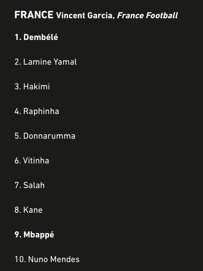 金球奖主办方《法国足球》公布了2025年男足金球奖投票详情,法国记者Vincent Garcia投票顺序前五为登贝莱、亚马尔、阿什拉夫、拉菲尼亚、多纳鲁马。