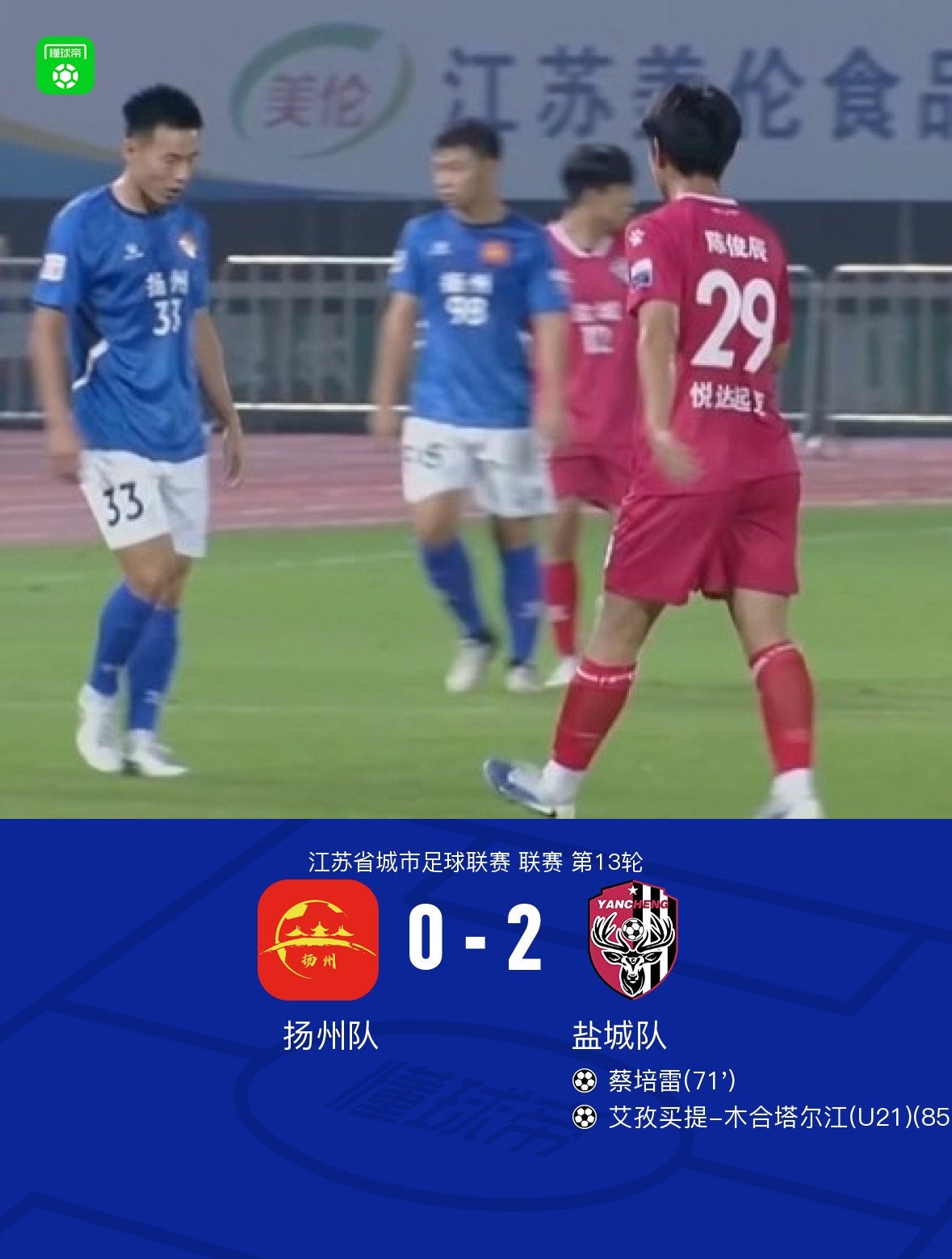 北京时间9月27日,江苏省城市足球联赛第13轮展开较量,扬州队坐镇主场迎战盐城队。比赛中,盐城队率先打破僵局,蔡培雷接队友配合后冷静施射得手,帮助球队取得领先。此后盐城队持续施压,并在随后由艾孜买提-木合塔尔江抓住机会再下一城,进一步巩固优势。最终,扬州队未能扳回比分,盐城队以2比0客场全取三分。