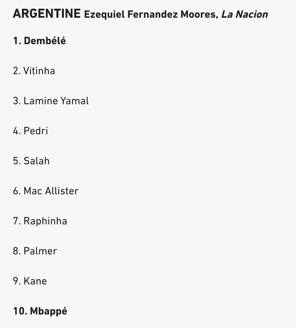 金球奖主办方《法国足球》公布了2025年男足金球奖投票详情,阿根廷记者Ezequiel Fernandez Moores投票顺序前五分别是登贝莱、维蒂尼亚、亚马尔、佩德里、萨拉赫。