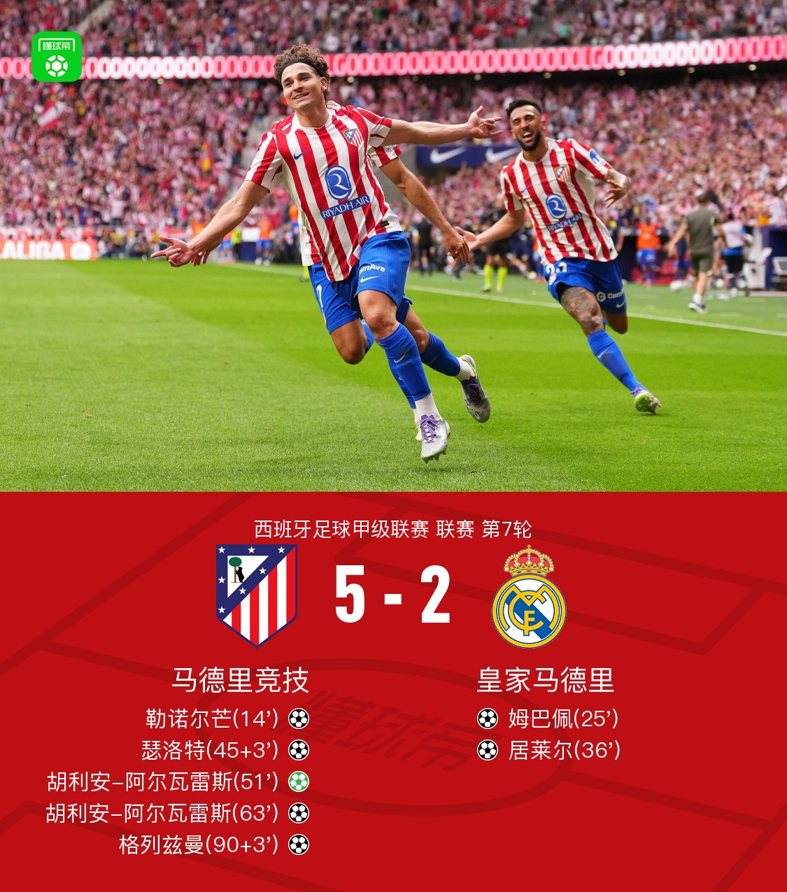 北京时间9月27日西班牙足球甲级联赛第7轮,马德里竞技主场对阵皇家马德里。马德里竞技勒诺尔芒率先头球破门,居莱尔助攻姆巴佩扳平,随后居莱尔抽射反超比分。上半场补时阶段瑟洛特绝平。下半场,胡利安-阿尔瓦雷斯点射+任意球破门完成梅开二度,格列兹曼比赛最后时刻破门。最终比分马竞 5–2 皇马。