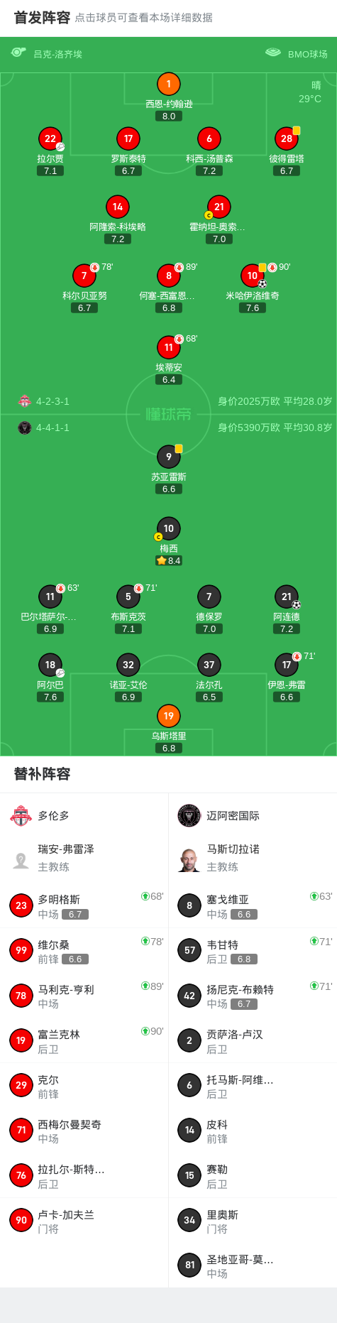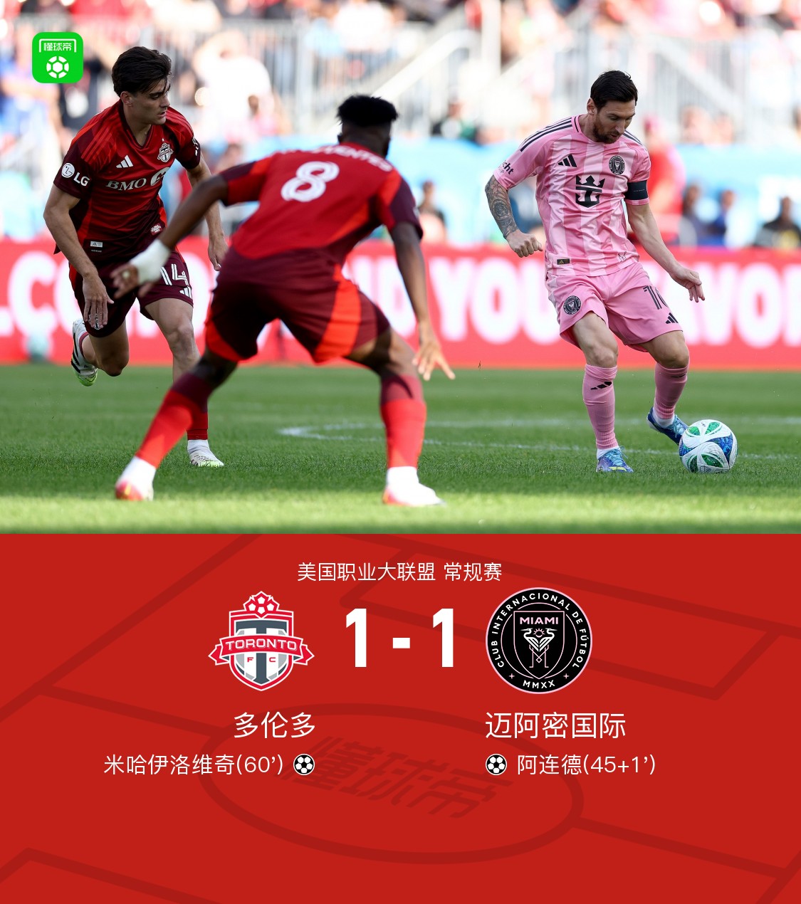 第60分钟,拉尔贾助攻,米哈伊洛维奇推射破门,多伦多1-1迈阿密
