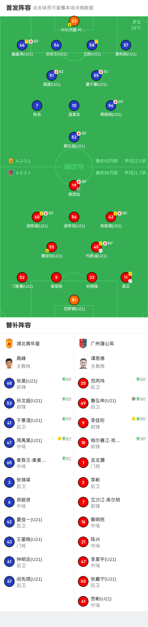 北京时间9月28日中国足球乙级联赛 决赛阶段保级组 第27轮,湖北青年星主场对阵广州蒲公英。广州蒲公英杨悠仙破门,詹弘申破门。最终比分湖北青年星 0–2 广州蒲公英。