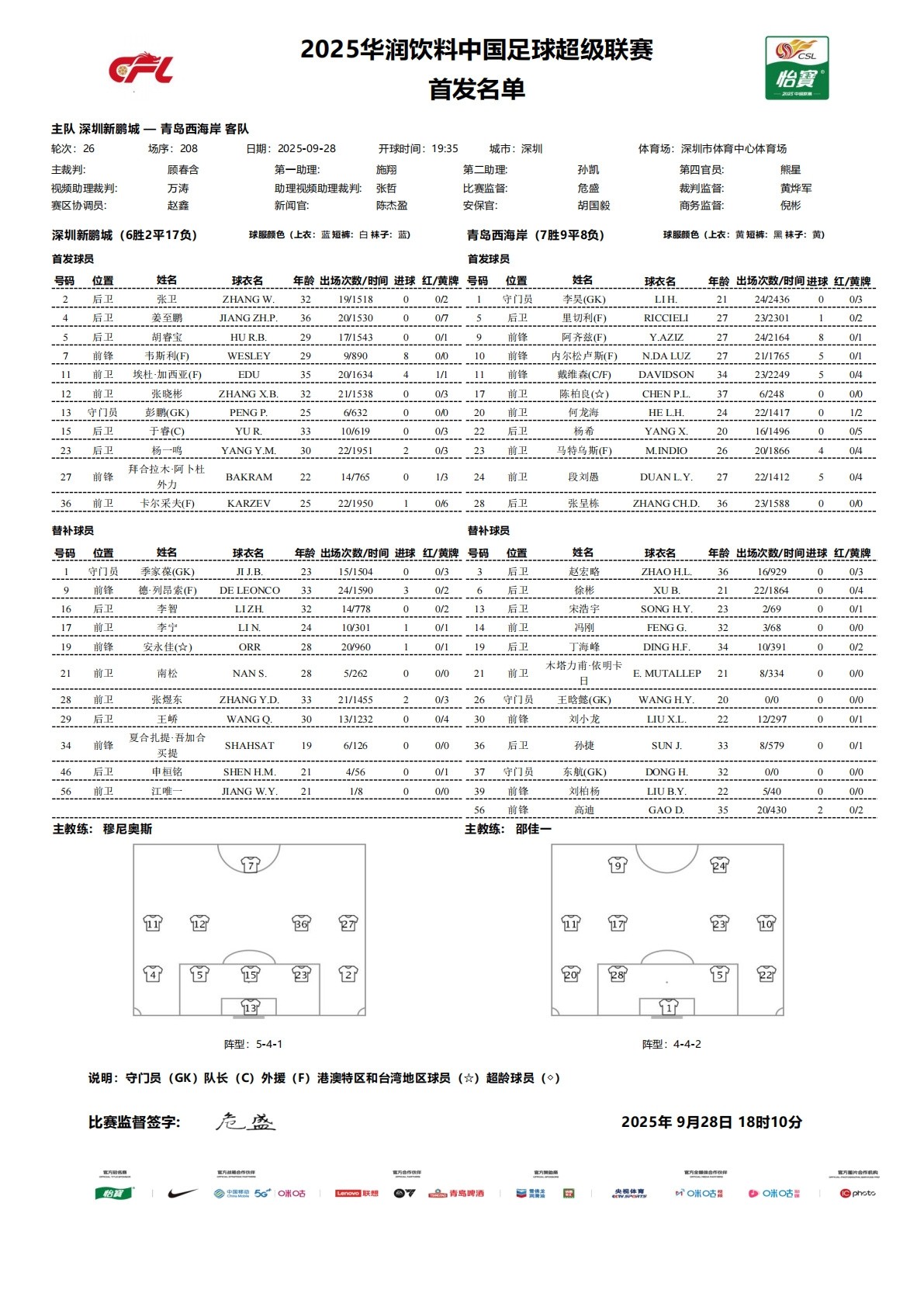 北京时间9月28日19:35,中超联赛第26轮,深圳新鹏城坐镇主场迎战青岛西海岸,本场比赛主裁判是顾春含,VAR是万涛,赛前双方公布首发: 文章导航 拉塞尔斯:期待与英超最佳之一的阿森纳比赛,我们充满信心 卡瓦哈尔:我们要继续努力并从错误中学习,以更强姿态站起来