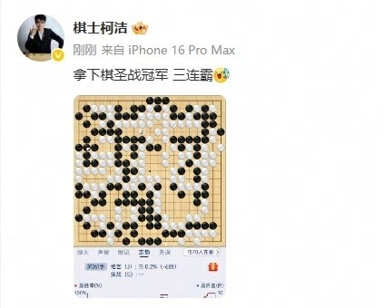 9月28日,柯洁执黑261手战胜挑战者屠晓宇,连续三届夺得棋圣冠军。 赛后,柯洁社媒回应卫冕棋圣:拿下棋圣战冠军,三连霸。