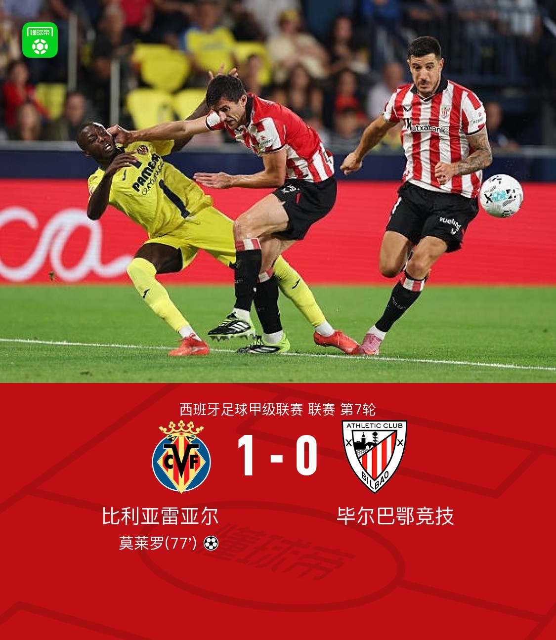北京时间9月28日,西班牙足球甲级联赛第7轮展开较量,比利亚雷亚尔坐镇主场迎战毕尔巴鄂竞技。比赛中,莫莱罗攻入全场唯一进球,帮助球队取得领先。最终,比利亚雷亚尔以1-0战胜毕尔巴鄂竞技,全取三分。
