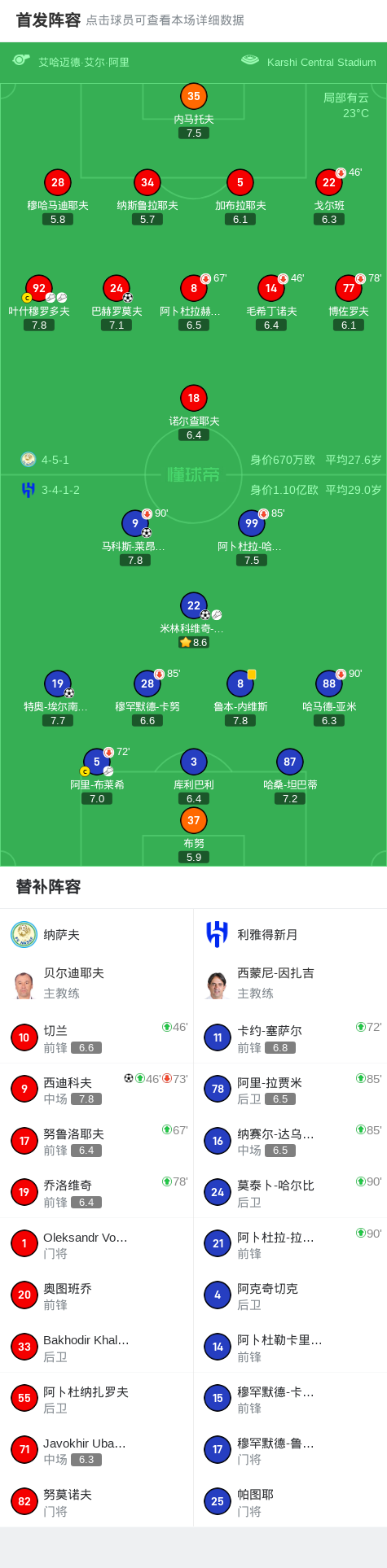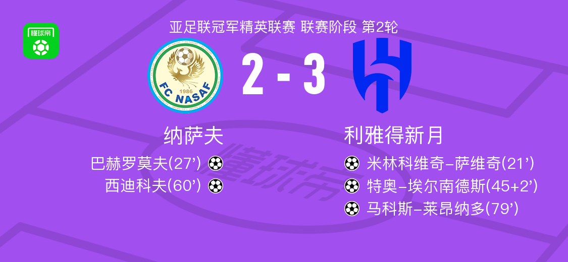 北京时间9月29日亚足联冠军精英联赛 联赛阶段 第2轮,纳萨夫对阵利雅得新月。纳萨夫巴赫罗莫夫破门,西迪科夫破门。利雅得新月米林科维奇-萨维奇破门,特奥-埃尔南德斯破门,马科斯-莱昂纳多破门。最终比分纳萨夫 23 利雅得新月。