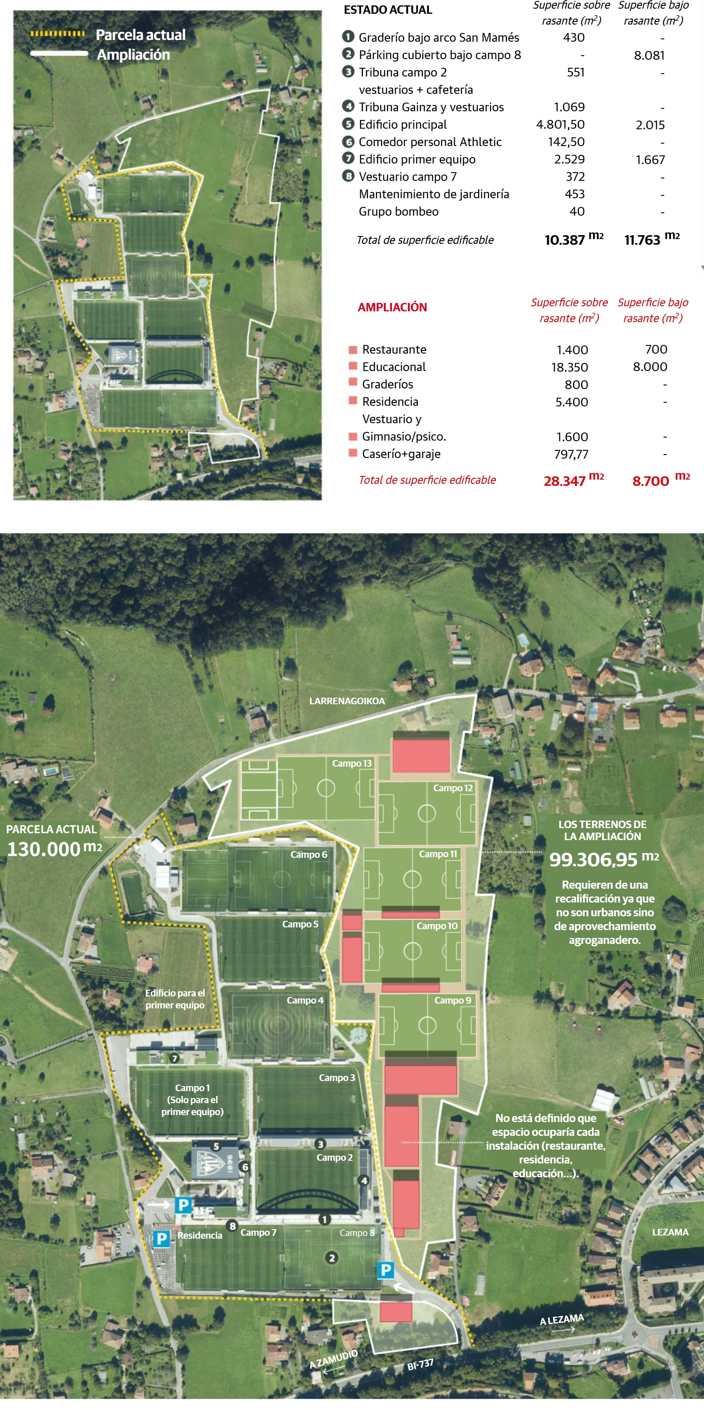去年春天,市政府初步批准了附属法规的修订,授权毕尔巴鄂竞技在邻近地块上总共建造28,350平方米的地上建筑和8,700平方米的地下室或停车场。如前所述,所有这些都规划在一块面积为99,306平方米的地块上。目前,莱萨马在一块130,000平方米的土地上,拥有10,400平方米的地上建筑和11,700平方米的地下建筑。
