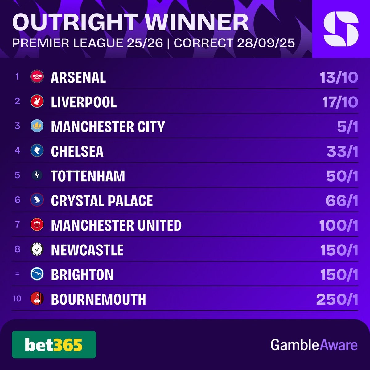 北京时间9月29日,在英超前6轮比赛结束后,Squawka列出了目前夺冠赔率最高的10支球队,阿森纳力压利物浦排名第一,曼城位列第三,近况不佳的曼联位居第七。